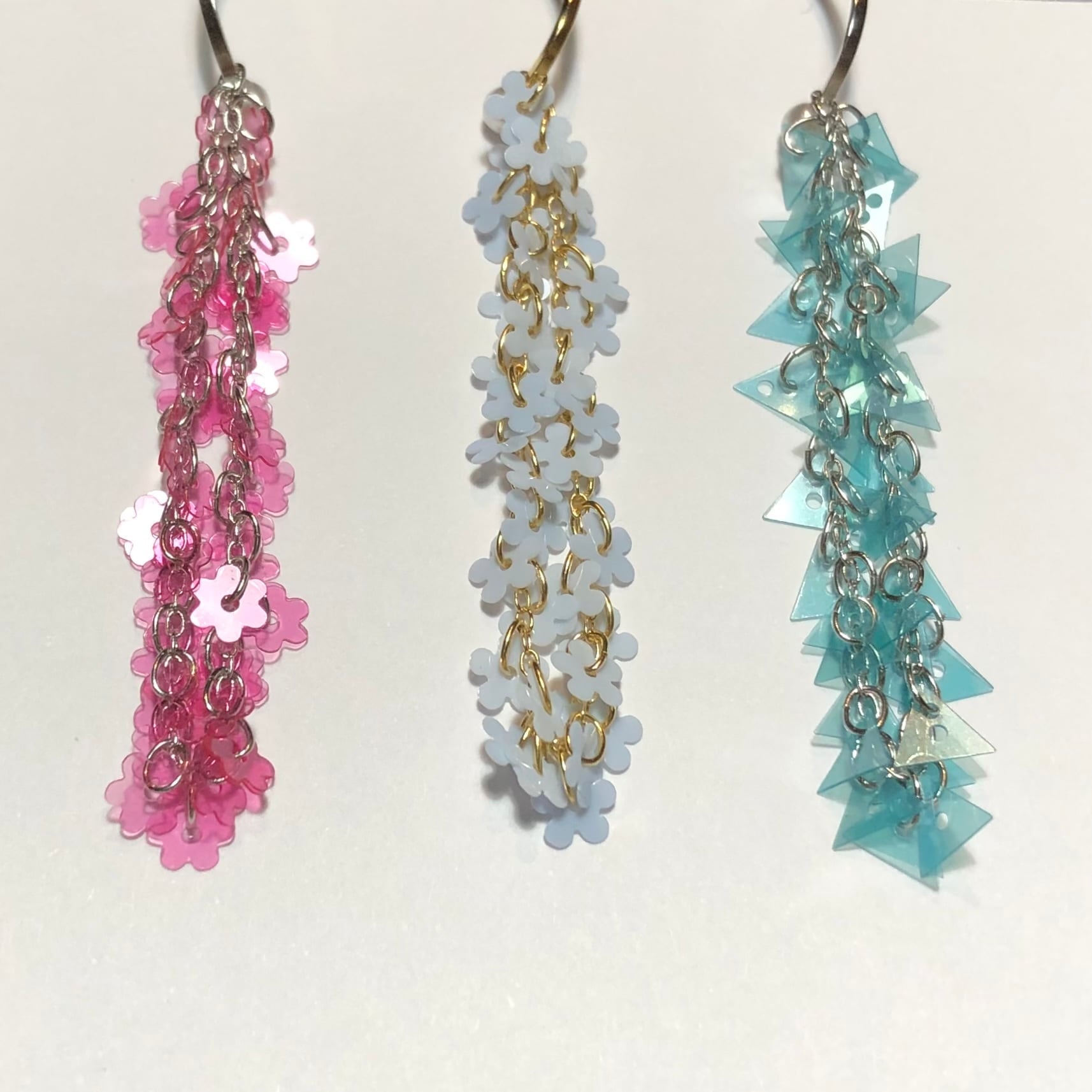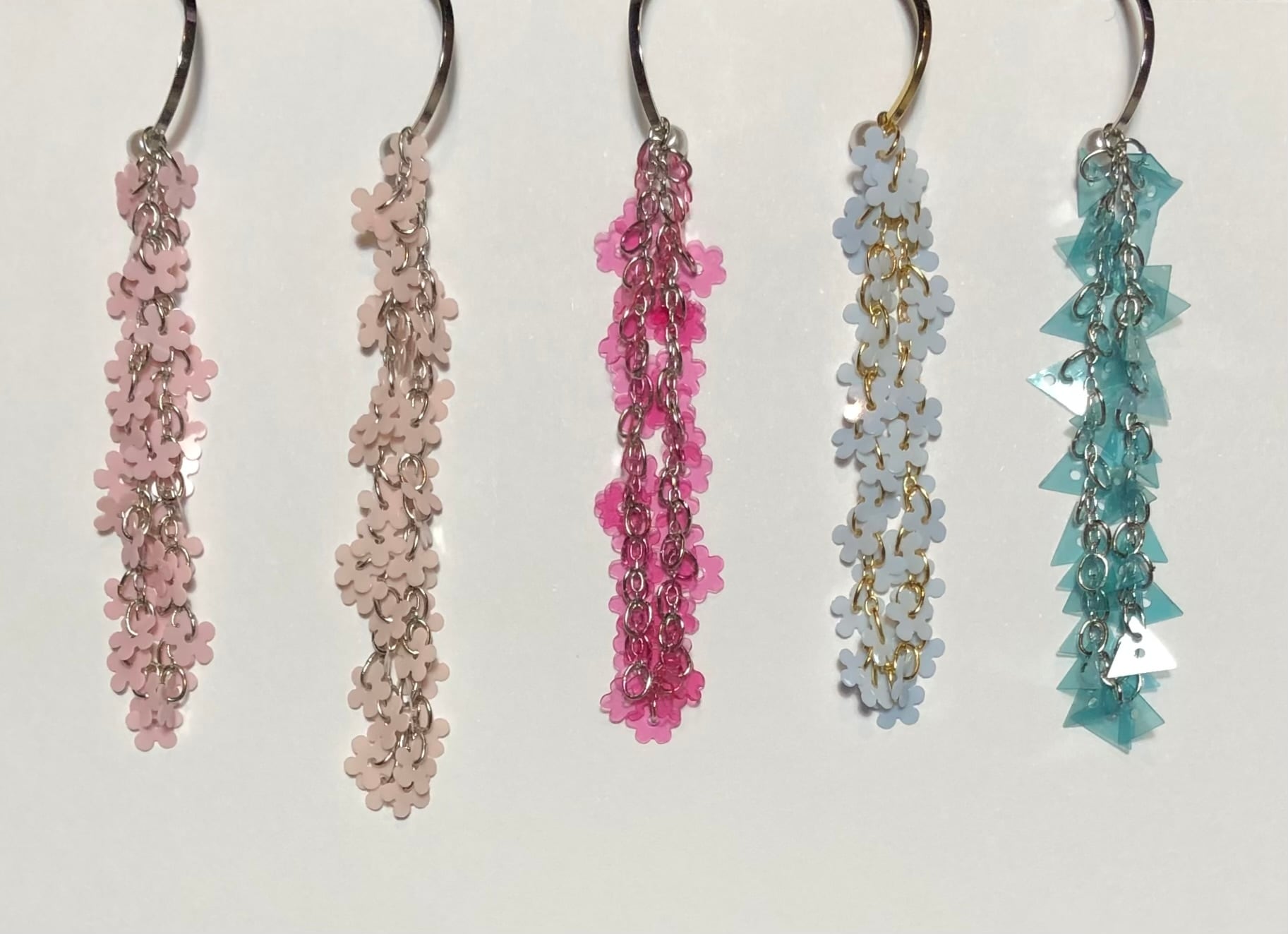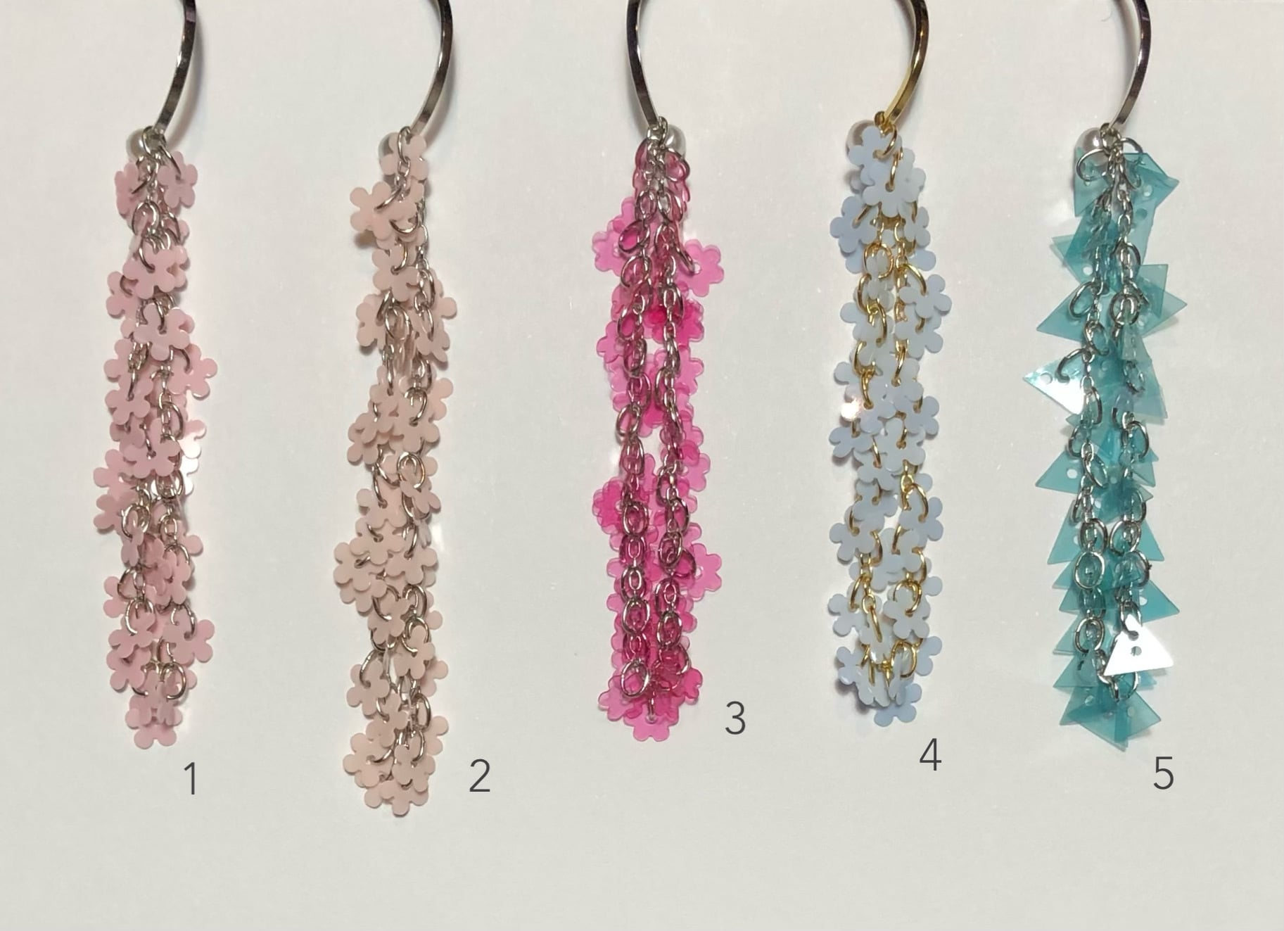 素材 ヴィンテージのスパンコール(3.5)、フランス製現行のスパンコール(1.2.4)、真鍮+メッキ、樹脂パール