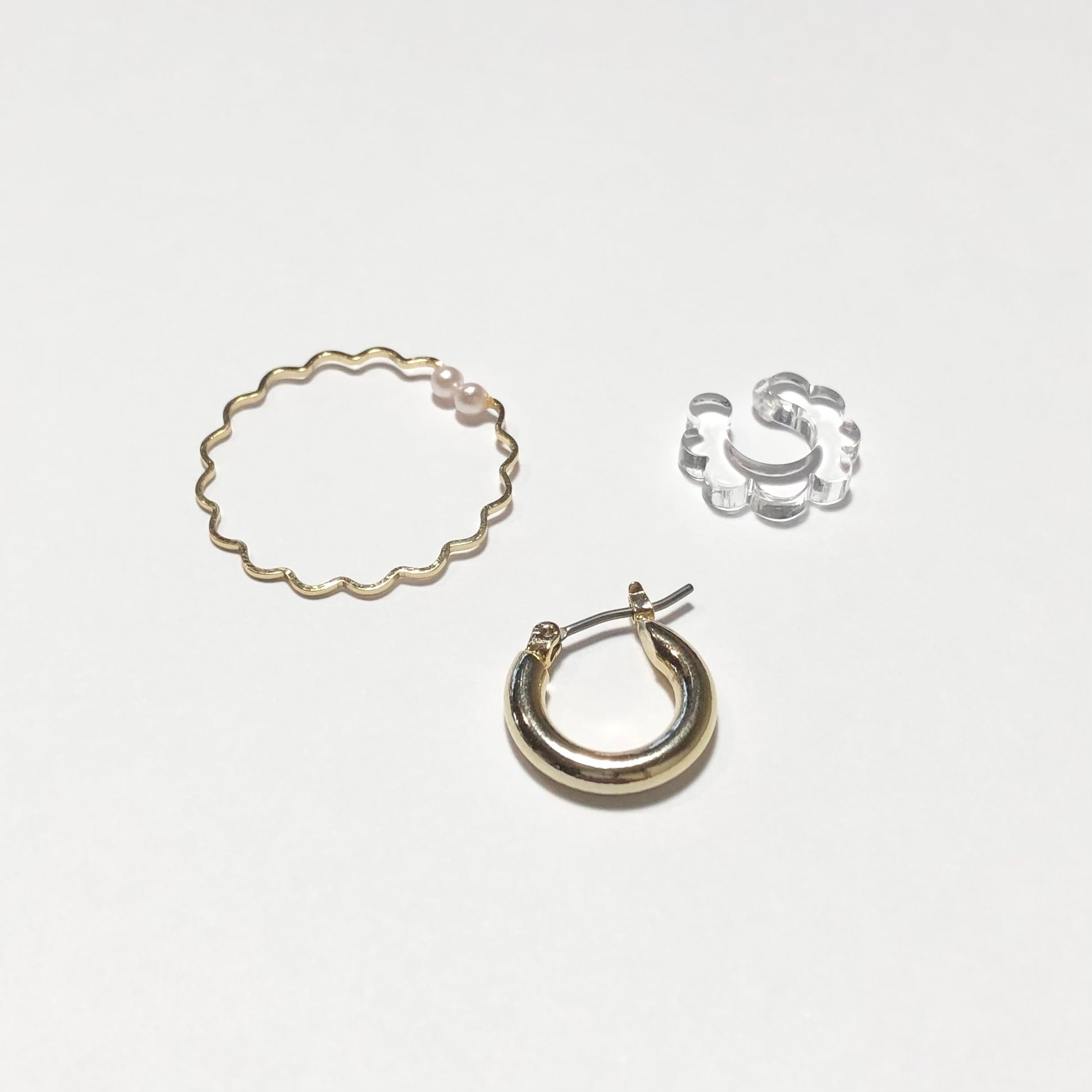 大きさ 約2.6mm(なみなみゴールドのイヤーカフ)約1.5cm(小さなクリアーのイヤーカフ)、約1.5cm(小さなフープピアス)