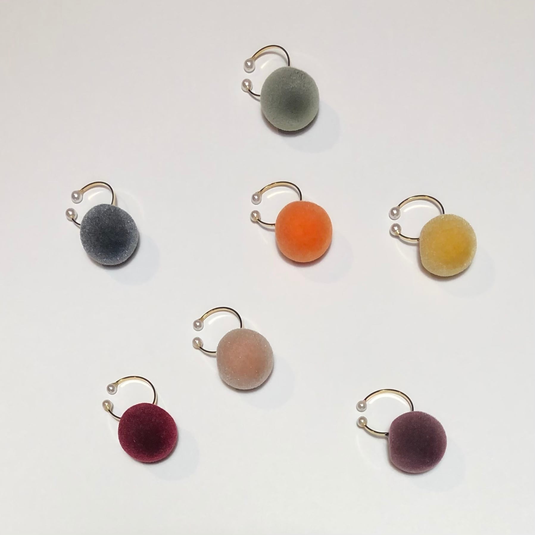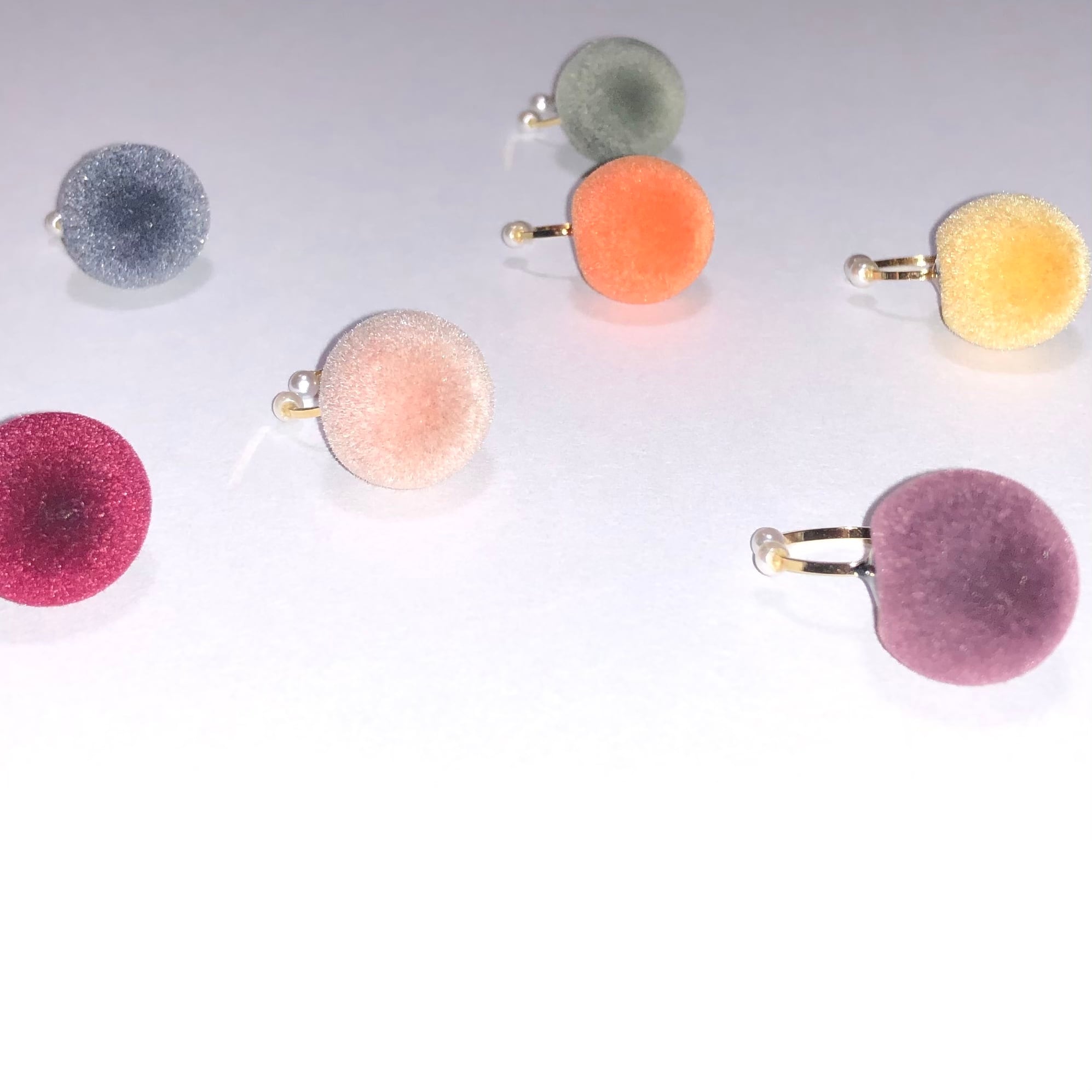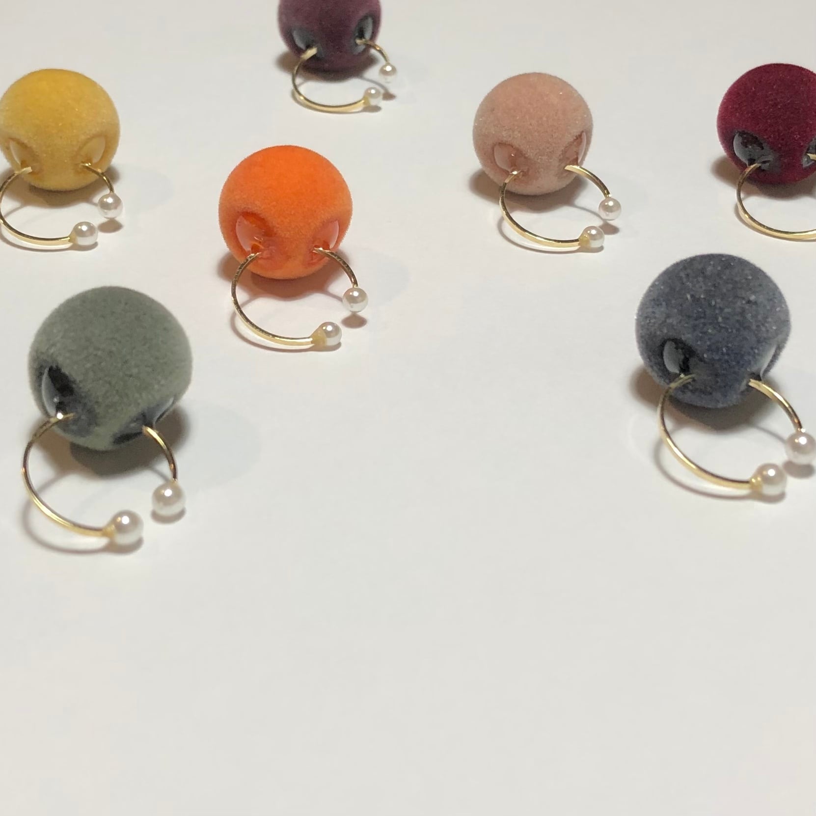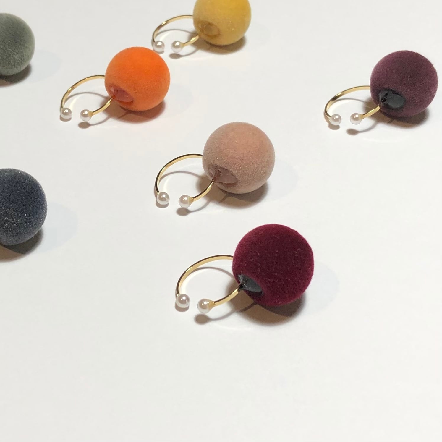 素材 アクリルビーズ(フロッキー加工)、真鍮+メッキ(イヤーカフ)、樹脂パール
