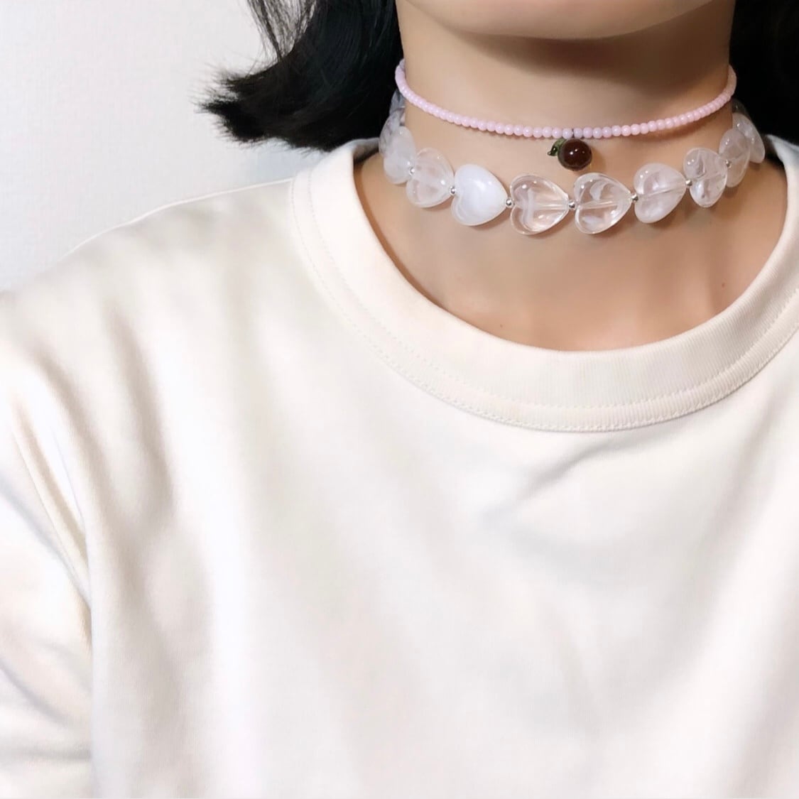 チョーカーの重ね付けはもちろん、華奢なネックレスとの重ね付けもおすすめ。